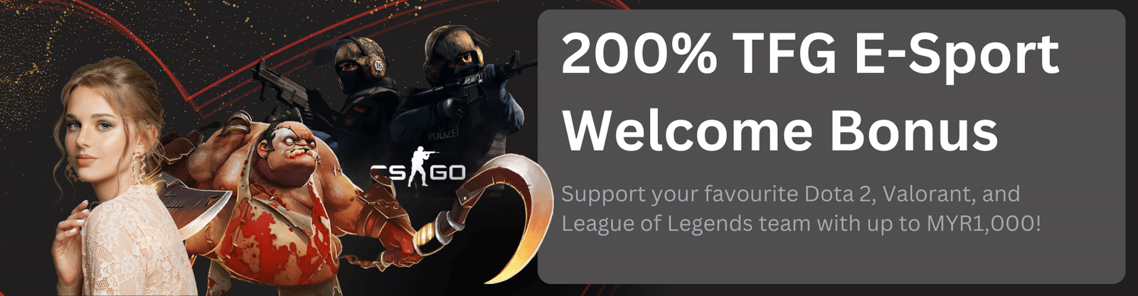 200% TFG E-Sport Welcome Bonus: If you’re a fan of e-sports, this bonus offers a 200% boost with a maximum cap of RM1000 and a 35x turnover requirement.