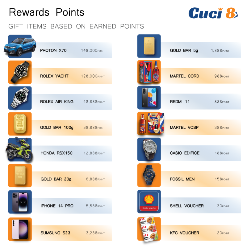 Cuci8 goes the extra mile to reward its players through its innovative reward points system. By collecting points while playing games, players can unlock a variety of sumptuous gifts. These gifts range from high-value items like the PROTON X70, Rolex Yacht, and iPhone 14 Pro Max to more accessible rewards like Apple Watch Ultra, Samsung S23 Ultra, vouchers, and much more. This unique rewards system adds an extra layer of excitement to the gameplay, as players can set their sights on tangible and impressive prizes.
