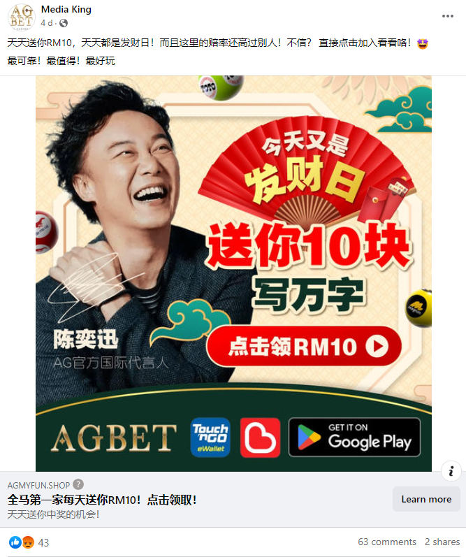 Another fake celebrity ambassador scam has been reported! Some of the readers have reported a misleading celebrity ambassador and fraudulently using Eason Chan’s portraits and even his name to promote online gambling platforms – AGBET