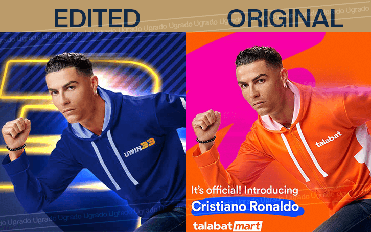 Based on Ugrado reviewer team inspection, the original image of Cristiano Ronaldo (right) was the official endorsement poster of Cristiano Ronaldo becoming Talabat brand ambassador on March 2022. Cristiano Ronaldo’s outfit has been “retouched” to feature the Uwin33’s branding and logo.