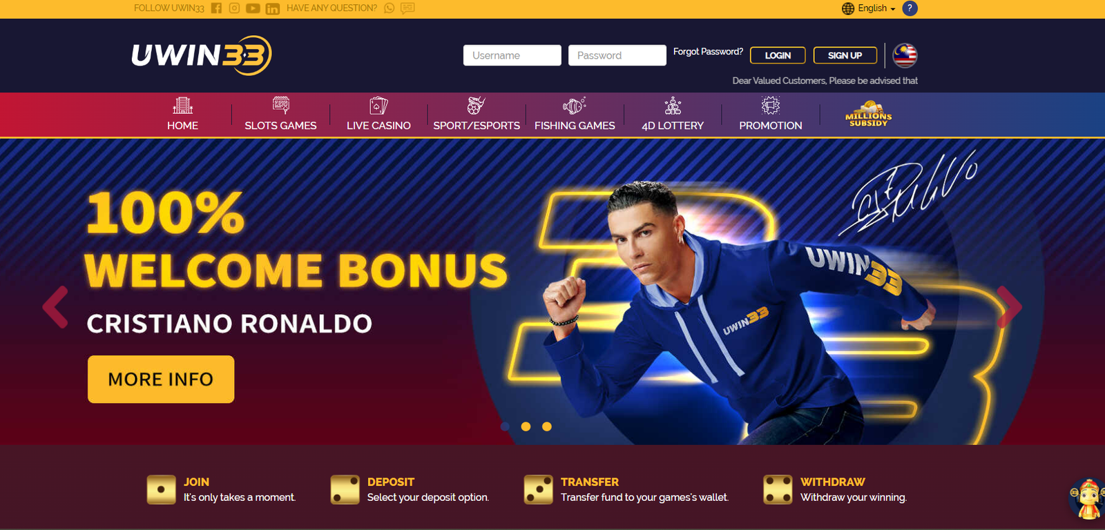 New problematic advertising has been found! Well-known Portuguese football player- Cristiano Ronaldo’s identity and signature has been misused in the poster on Uwin33 Facebook, as well as on Uwin33’s website homepage and promotion section in promoting the platform bonuses.