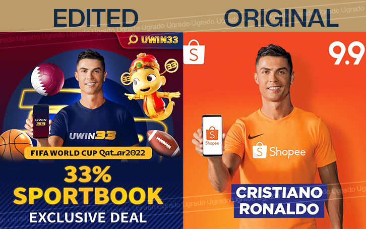 The original image (on the right) was the promotional visual for Shopee, as Cristiano Ronaldo was the regional brand ambassador back in 2019. The original shopee logo and iconic orange shirt has been “retouched” into the Uwin33 logo and Uwin33’s brand colour (blue). View original source >>