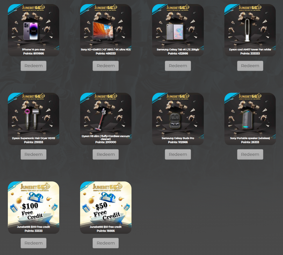 Junebet66 offers an enticing point system that allows players to redeem a variety of rewards. From the latest iPhone 14 Pro Max to a Sony TV 43-inch and a Dyson Supersonic Hair Dryer, players can earn these attractive items through the point redemption system. Additionally, players can also redeem free credit to further enhance their gaming experience. Notably, the platform even offers 918Kiss free credit, which can be used in conjunction with the Junebet66 point redemption system.