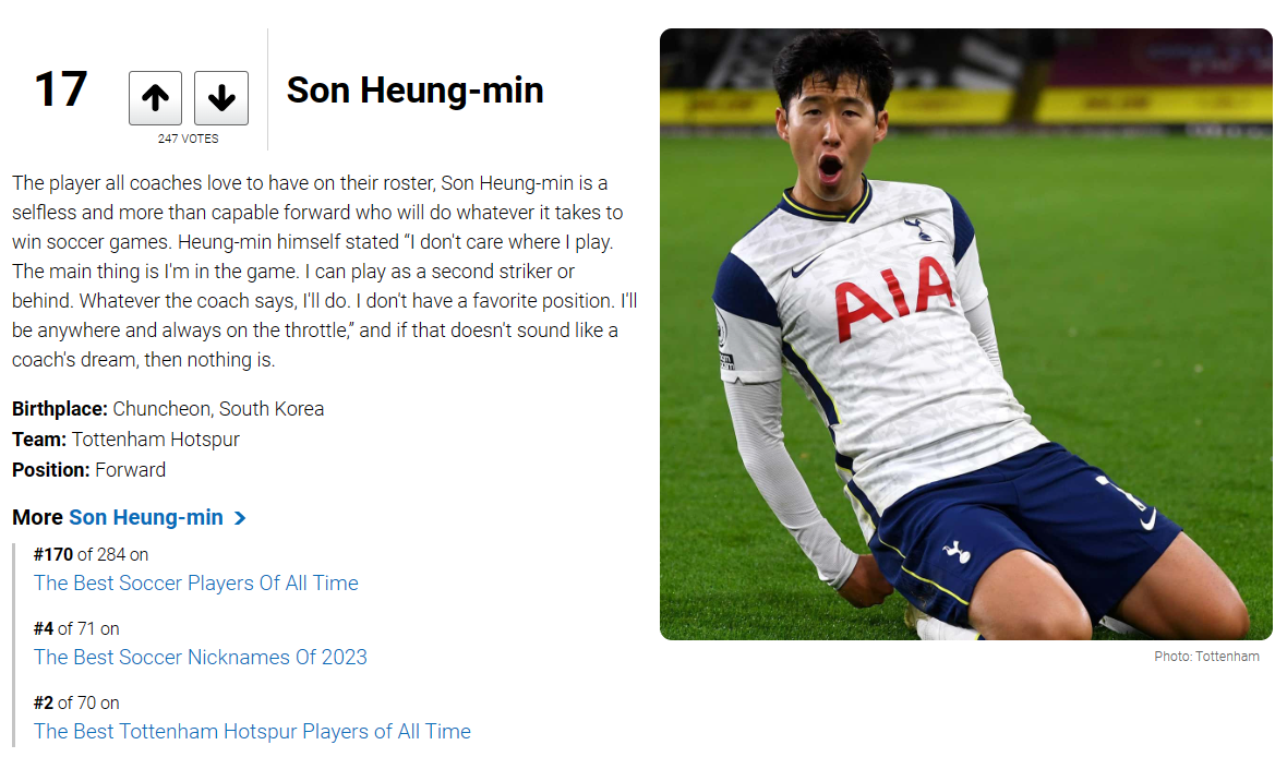 Son Heung-min is a South Korean footballer who plays as a forward for and captains both Tottenham Hotspur and the South Korean national team. He is the first Asian player to score 100 goals in the Premier League.