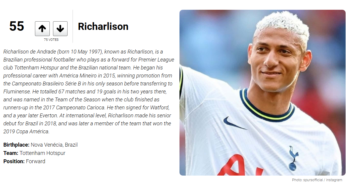 Richarlison is a Brazilian footballer who plays as a striker for Tottenham Hotspur and the Brazil national team. He was born on 10 May 1997 in Nova Venécia, Brazil231. He joined Tottenham from Everton in July 2022.